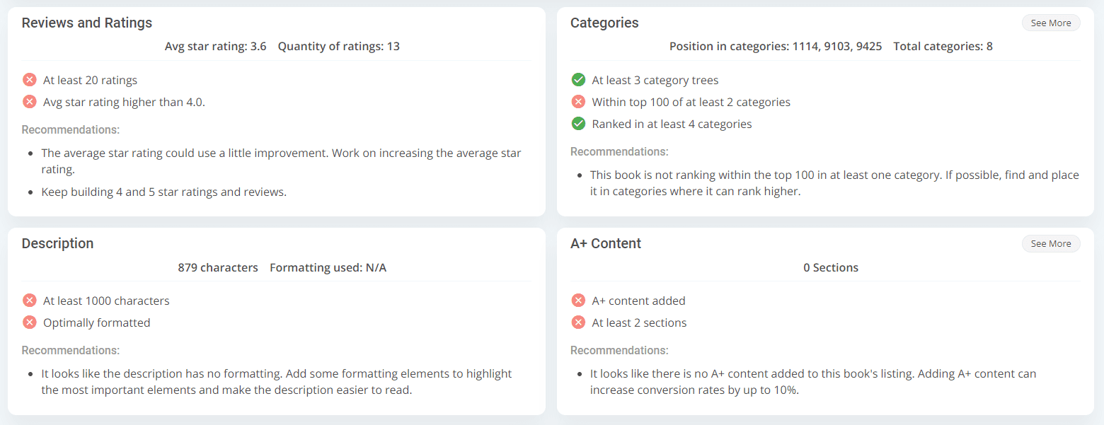 A good tool you can use to check if your listing has issues is BookBeam. It enables authors to quickly and easily analyze and improve the key components of their book listings, including titles, subtitles, descriptions, and keywords.