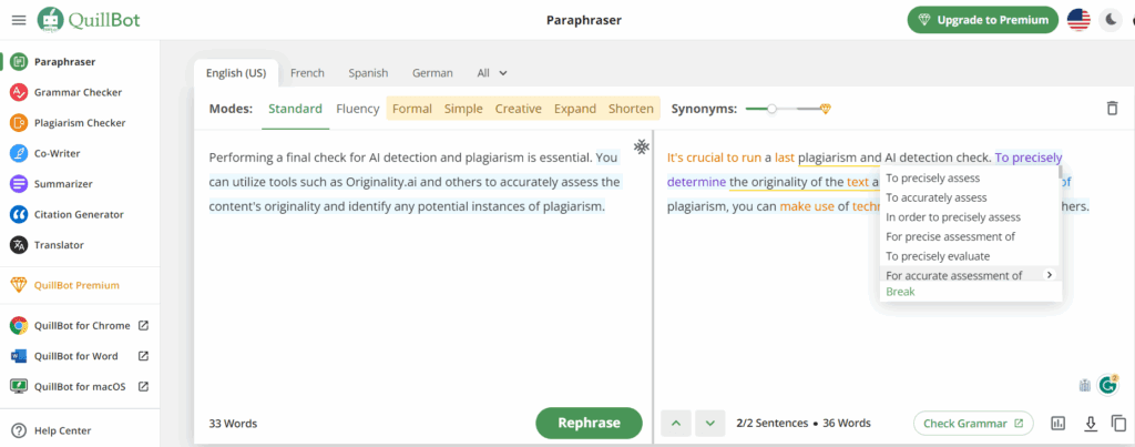 - Customize the content by rewriting it, doing fact-checking, and adding your own input. This step is important to avoid plagiarism and ensure accuracy. You may want to use QuillBot to paraphrase and improve the content because it automatically rewrites paragraphs and even entire articles by changing sentence structure and substituting some words for others. It’s easy to use, making it a good option for those who prefer a straightforward approach.
