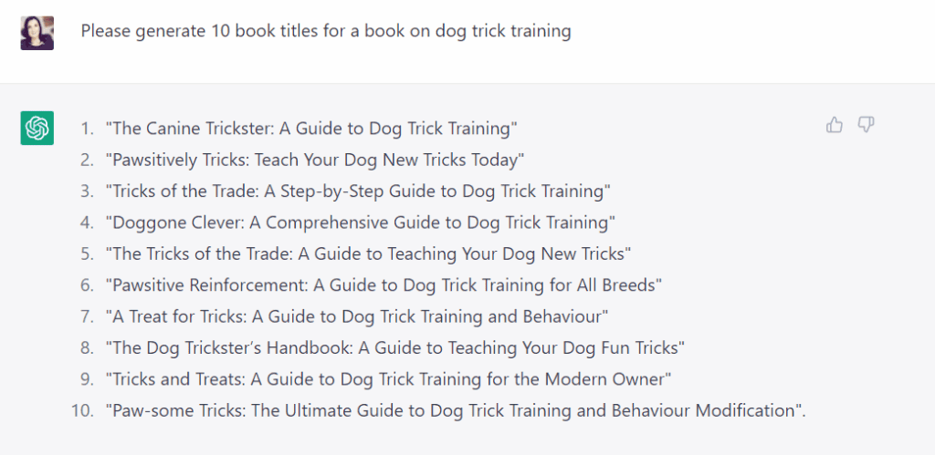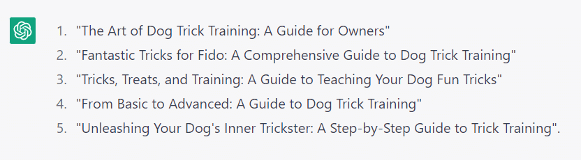 - In the text field, provide a brief description or summary of the main topic or theme of your nonfiction book and ask ChatGPT to generate a list of potential titles based on your description. Let’s say I’m going to write a book about training dogs, and I want to come up with 10 titles for it. Here is what I got.