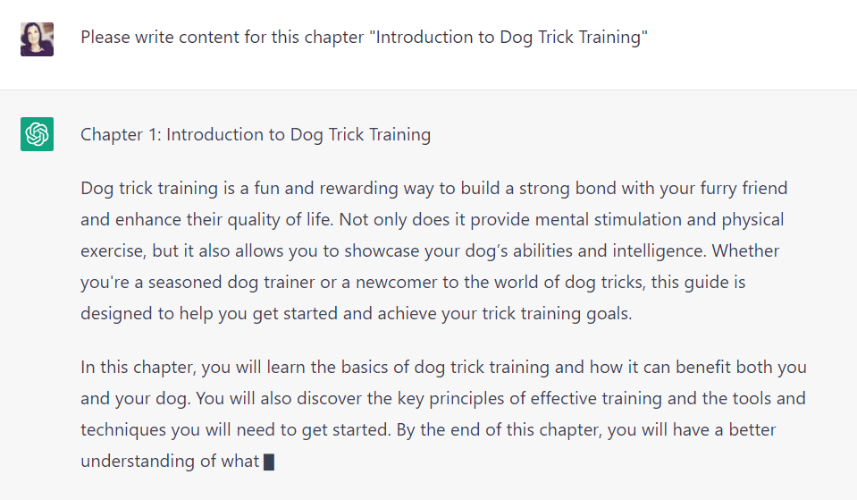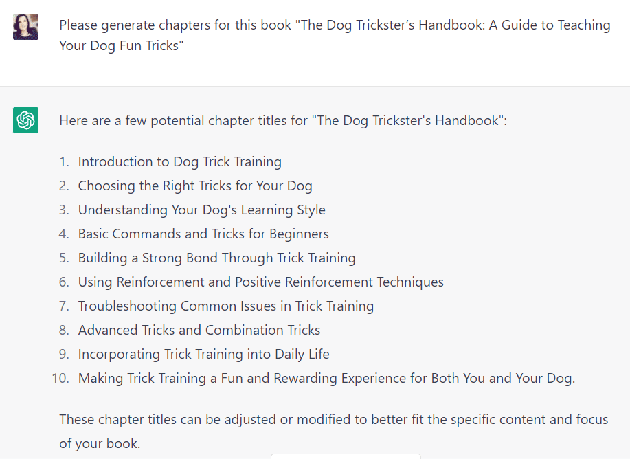 Once you have your title, go to the ChatGPT website, paste it in the text field, and ask it to generate book chapter titles. Let’s use one of the titles that I got for my dog training book to see how it works, for example, “The Dog Trickster’s Handbook: A Guide to Teaching Your Dog Fun Tricks”. Hit enter and let the artificial intelligence do its work. ChatGPT will generate a list of potential chapter titles based on the book title and conversation prompts you provided it with. These chapters will serve as a starting point for your nonfiction book, giving you a rough outline of the content that you need to write. Here’s what I got.